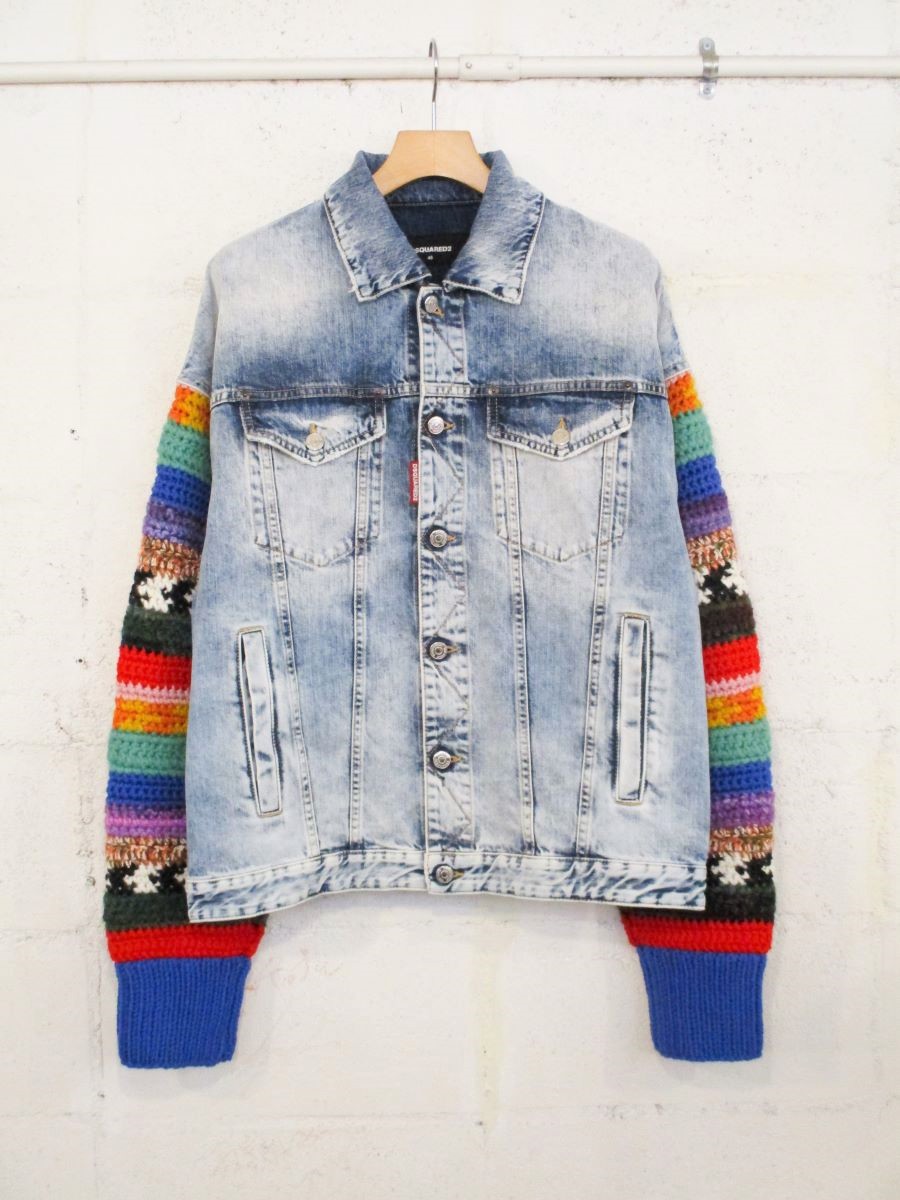 身頃はデニム地、両袖をかぎ針編み仕立てのカラフルなニットで切り替えたほかにはないデザイン!!