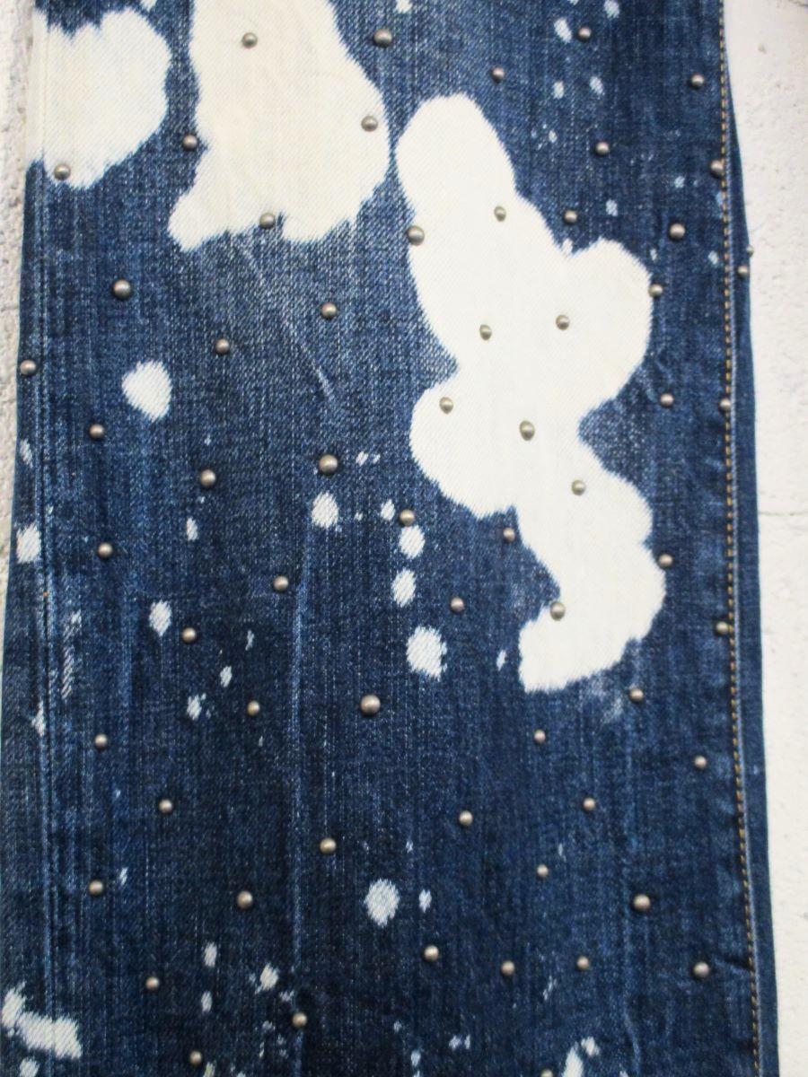 濃いめのウォッシュにブリーチでメリハリをつけ、スタッズを散りばめた個性的なデザインの「ROADIE JEAN」