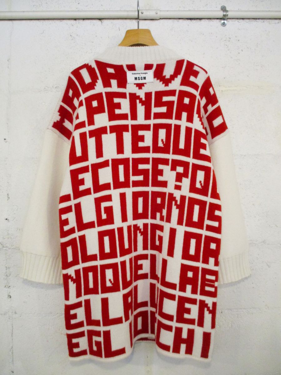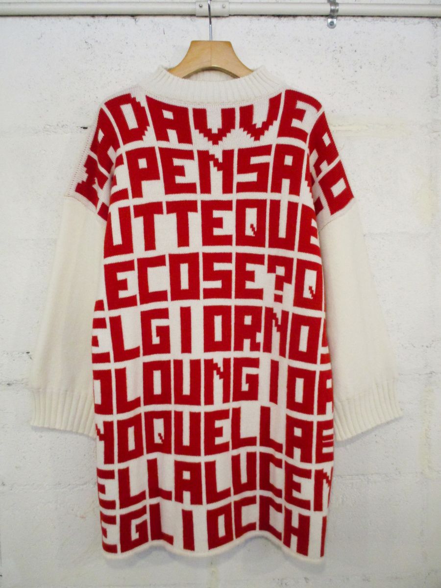 ウールとアクリルをブレンドした柔らかなニット素材に、詩的なメッセージをジャガード織りで大胆に仕上げたデザイン!!オフホワイトのボディにアシッドレッドのレタリングが映えて、コンテンポラリーな存在感を放ちます。
