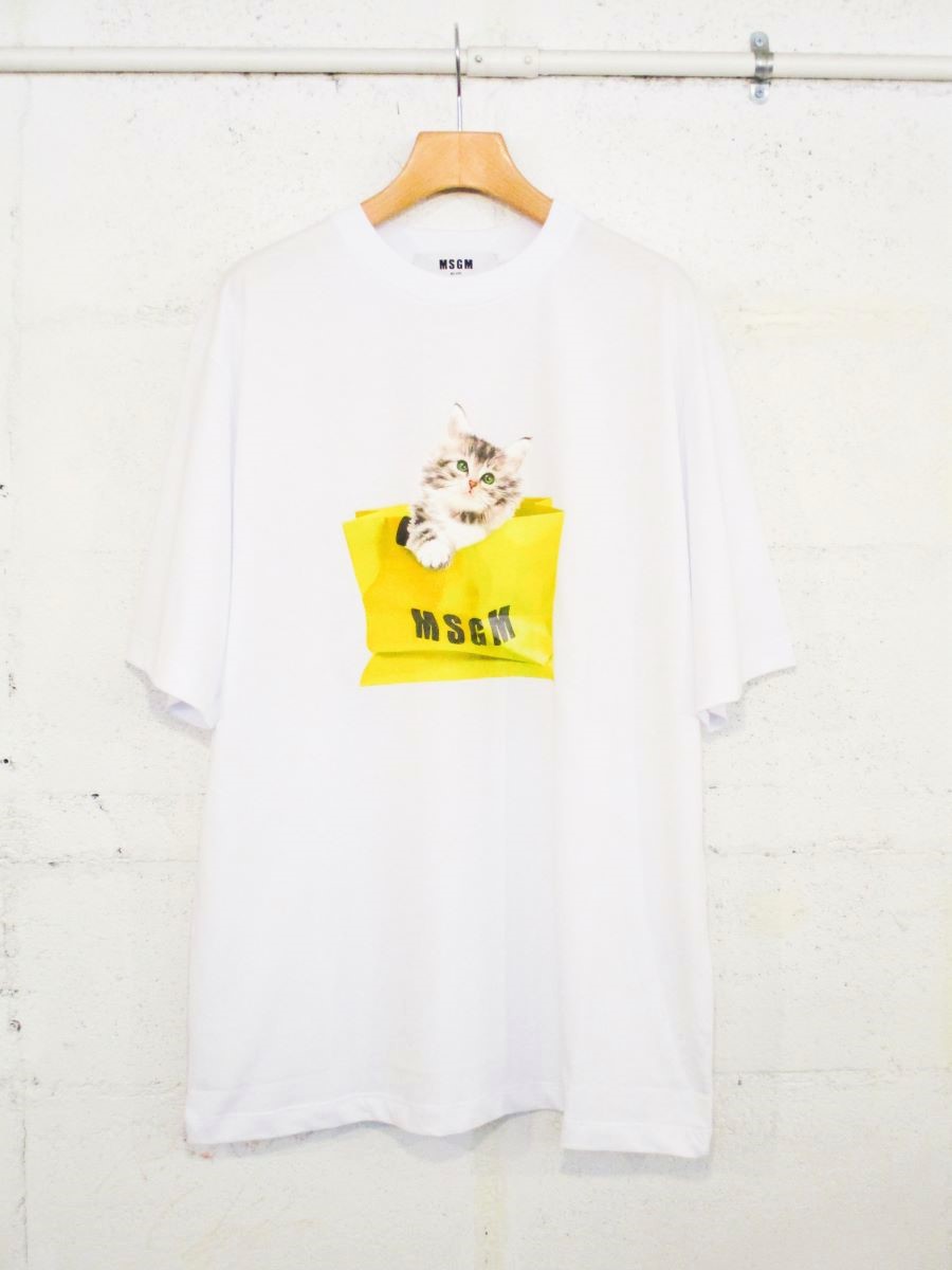 MSGMのショッパーバッグから顔を覗かせるCUTEな猫が印象的な遊び心溢れるデザインです。