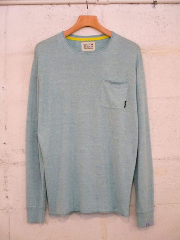 胸ポケット部分の「×××」の刺繍や、左袖口の小さなロゴラベルがアクセントになったシンプルなデザインです。襟や裾はくるんとロールした仕上げで軽やかな印象に。